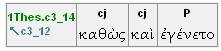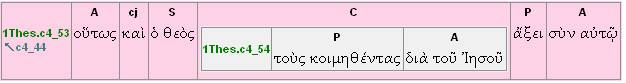 In 1 Thess. 4.14 (clause 1Thes.c4_53 in the annotation), the verb ἄξει, "he will lead," gives a material process. God will do something to those who died through Christ, specifically he will bring along with Christ those who have died through Christ.