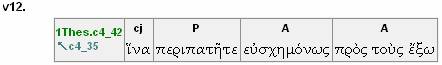 In 4.12 (clause 1Thes.c4_42), the verb περιπατῆτε, "you may walk" (conduct yourselves) is a behavioral process, being an outward expression of inner workings of mindsets, desires, intentions, etc. leading to conduct).