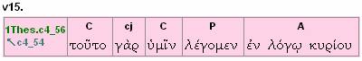 In 4.15 (clause 1Thes.c4_56), the verb λέγομεν, "we say," depicts a verbal process. What is said is "this" (the content of "this" is spelled out in subsequent clauses, basically the fact that those who are alive and remain at Christ's appearing will not have an advantage over those who have died is recognized, constructed in Paul's consciousness, and expressed verbally).
