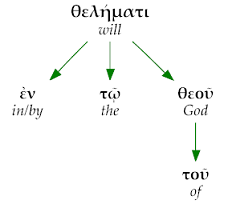 An illustration of how the analysis of word group modification can be seen in the word group ἐν τῷ θελήματι τοῦ θεοῦ ('in/by the will of God') from Rom. 1.10. The head term is θελήματι, which is modified directly by three words: ἐν, τῷ and θεοῦ. The last of these modifiers,θεοῦ, is in turn modified by τοῦ. This analysis is illustrated in the dependency tree diagram to the right.